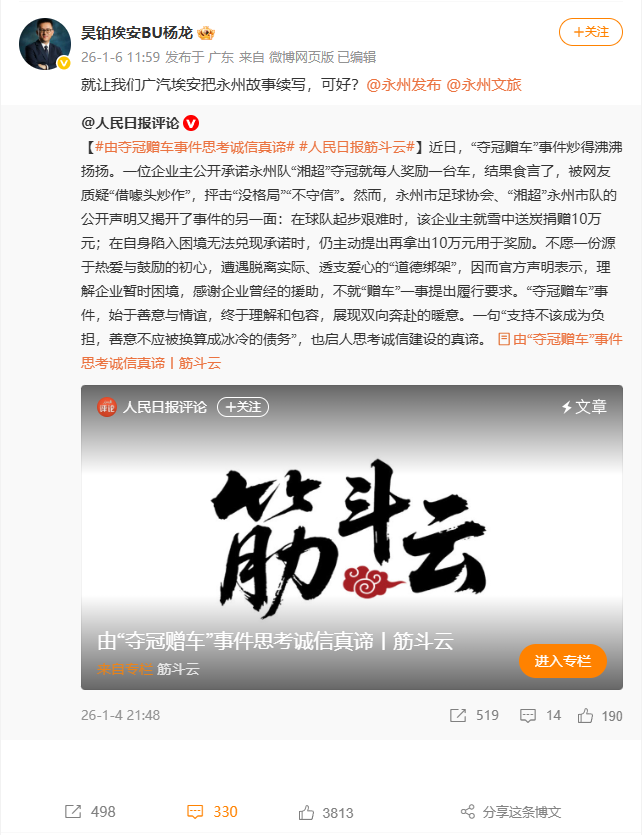 1 月 7 日,广汽埃安的负责人看到报道后,直接发声:“就让我们广汽埃安把永州故事续写,可好?”