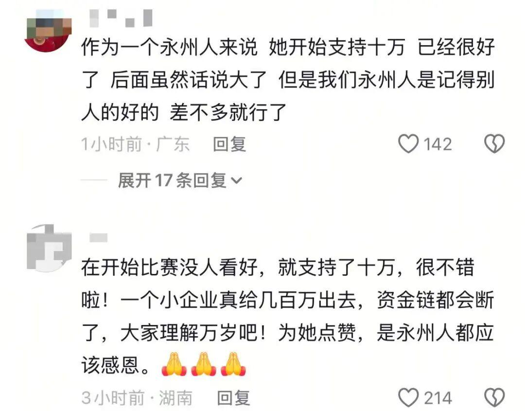 她是永州新兰天集团的董事长,不仅先掏了 10 万块赞助,还当着全网的面放狠话。