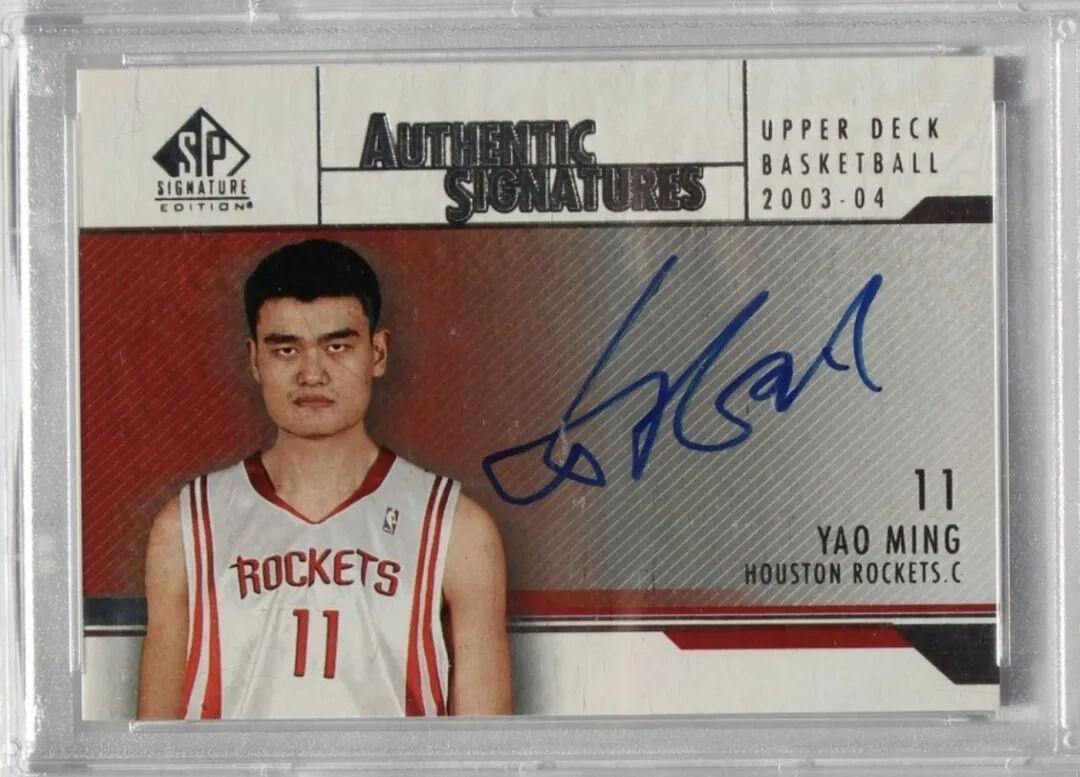 这张2003年Upper Deck公司的姚明“SP Authentic Rookie Signatures”也是收藏者们梦寐以求的珍品之一。卡片正面印有姚明新秀赛季的人像,并有蓝色亲笔卡签,作为限量发行的签名卡整体设计简洁大气。市场上PSA9分评级后价格约为 2400元,BGS 10分卡可高达20000元左右。由于姚明早期签名卡种的稀有性,这张卡片不仅具备高观赏价值,也具有长期稳步上涨的收藏投资潜力,是高端收藏者必备的精品。
