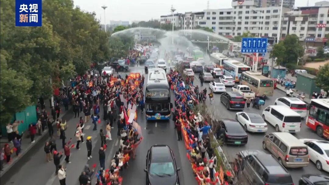 消防车还开起“过水门”仪式,工作日里不少市民请假庆祝,整座城市热闹得像过年。