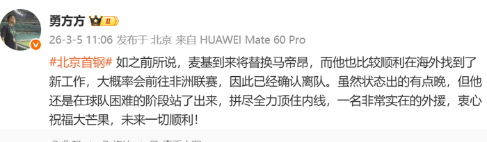 昨天麦基已经抵达北京了,他也会开启第二阶段的备战。当然麦基加盟之后,球队肯定要有人离开,最终马帝昂成为了牺牲品。根据曝光的消息来看,马帝昂已经找到了海外的工作,这样的速度也确实快。也没有办法,马帝昂应该早就知道自己要离队的消息了,特别是麦基确定加盟之后,他就要做好准备了。