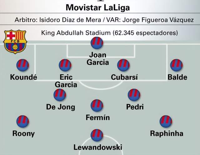 锋线上,莱万出任中锋,拉菲尼亚居左,小将鲁尼-巴德吉踢右边锋。20岁的鲁尼-巴德吉,本赛季13次代表巴萨出场,贡献1球2助。如果亚马尔身体无碍,鲁尼-巴德吉将让出主力位置。